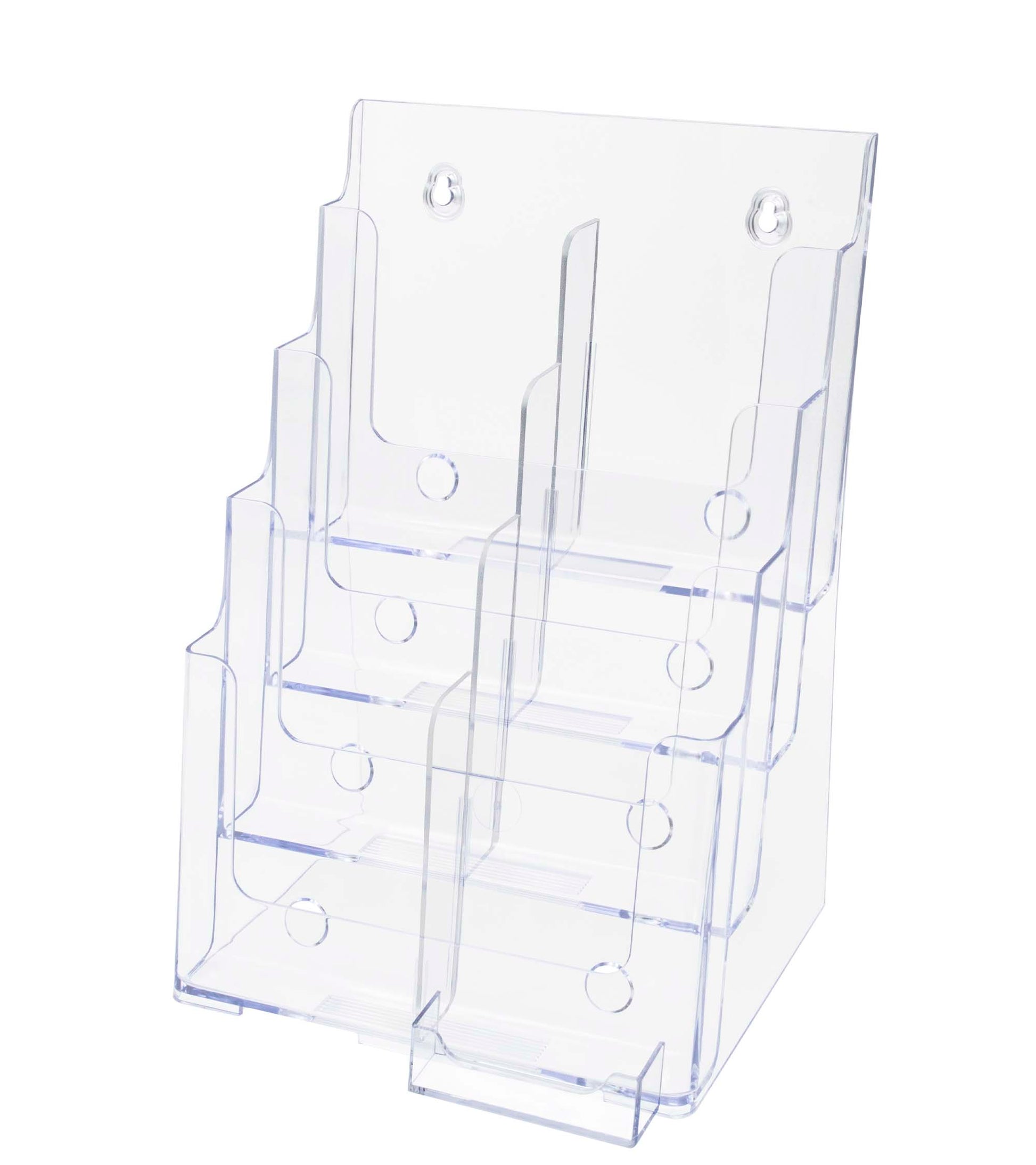 The organizers are made of durable clear plastic such as acrylic, plexiglass, lucite and PETG polycarbonate materials. The brochure holder features a clear see-through pocket that offers a view of your printed media. These display holders are ideal for placement in doctor offices, hotels, amusement parks, government and business buildings, community centers, welcome centers or travel agencies. This stand is durable for use at colleges and universities, convention centers, restaurants, sports stadiums across the USA.