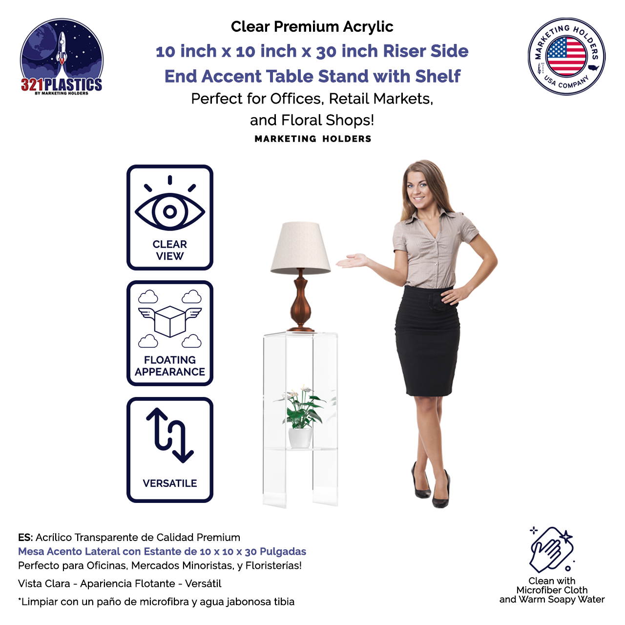 Marketing Holders Riser table is made from clear acrylic plexiglass and is durable making it great for use retail locations. Our double riser will add beauty and function to any space. Crafted of clear acrylic, this double shelf unit adds a clean and modern look to its environment, while also conveniently providing additional storage space. This versatile double riser is perfect for professional spaces, events, galleries, and so much more.