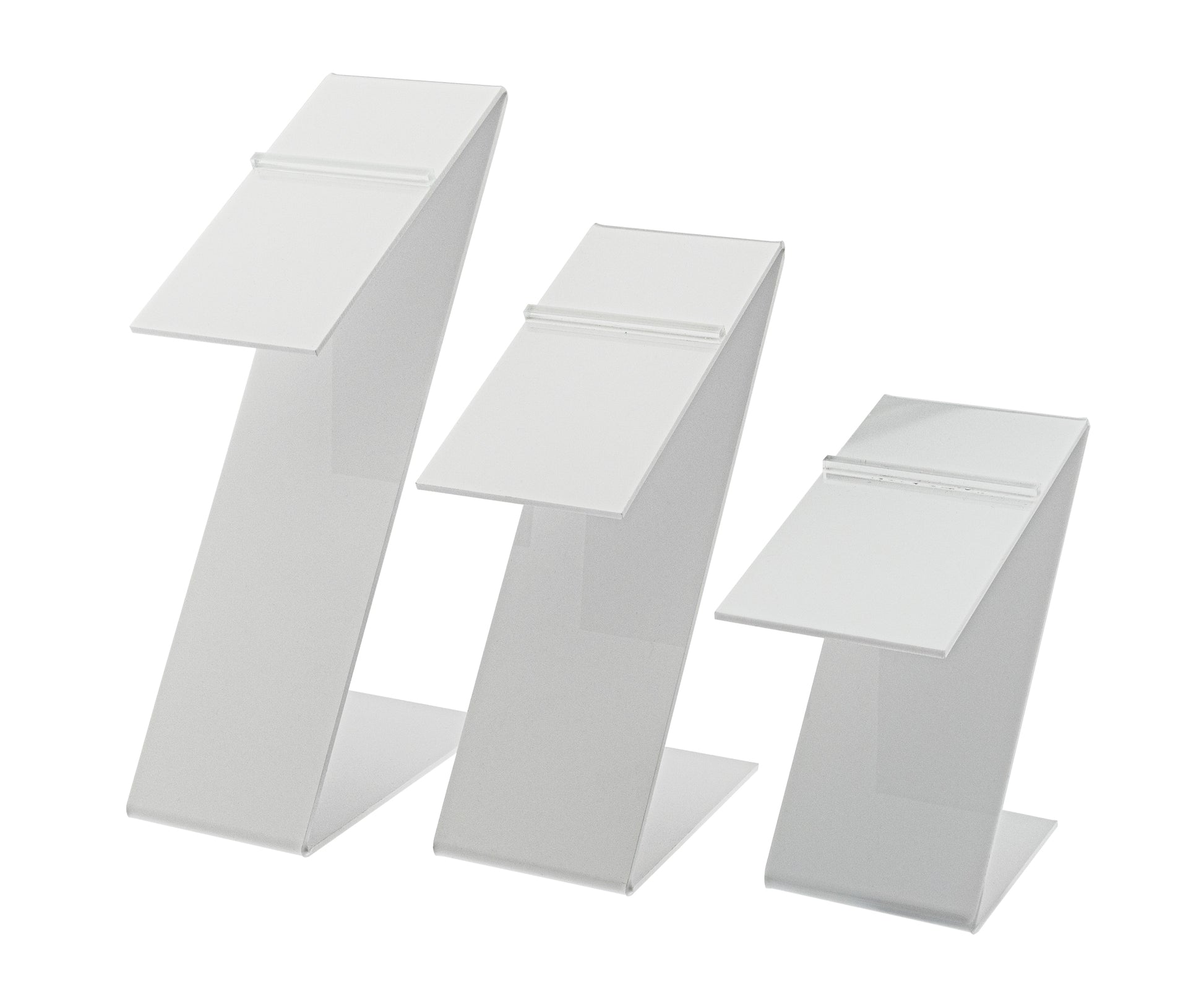 These 3 piece Z shaped shoe pedestals let you create unique and professional displays and includes a small, a medium and a large sized riser. The acrylic displays are the perfect way to showcase your shoe collection and come in a variety of colors. This slanted Z shoe lifter is designed to hold shoes at an elevated level that creates a professional presentation for customers. The heel stop keeps the shoes in place while the slanted design offers customers the best view of your product. These elevated design makes these risers perfect for photographing your collection or inventory.