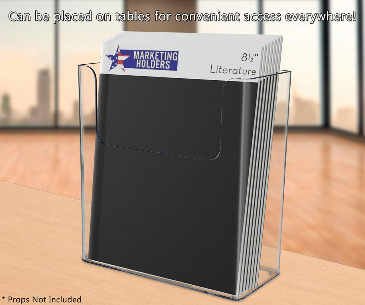 Marketing Holders versatile holder provides a simple yet effective tabletop or hanging display for 8.5”W promotional literature, catalogs, magazines and flyers. Many businesses find these marketing aids useful to spread the word about their upcoming promotions, products, services and events. These heavy duty catalog stands can be used on flat surfaces such as tops of a table, counter or desk near entrances and exits or reception areas so customers are prompted to take one when visiting your business. This literature holder comes with 2 pre-drilled keyholes and is designed to easily hang on smooth surfaces if counter space is limited. Elegantly showcase flyers or magazines while saving space and keeping areas looking professional, clutter free and organized.